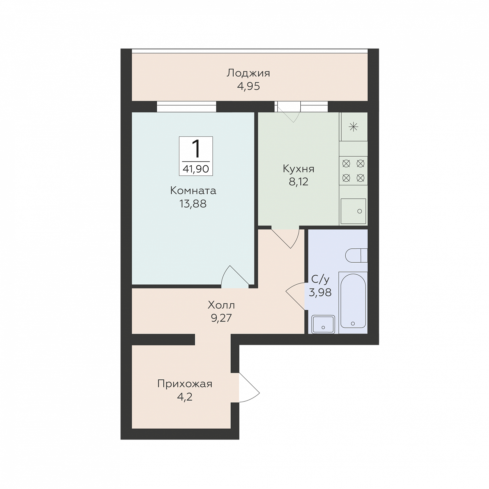 1-комнатная квартира, 41.9 м2, 10 этаж, №478, Классики