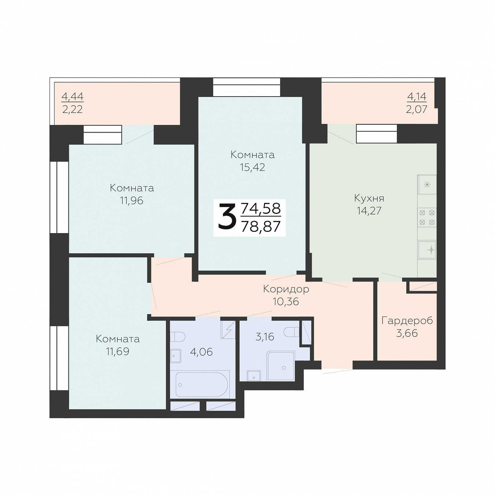 3-комнатная квартира, 78.87 м2, 20 этаж, №185, Зарядье
