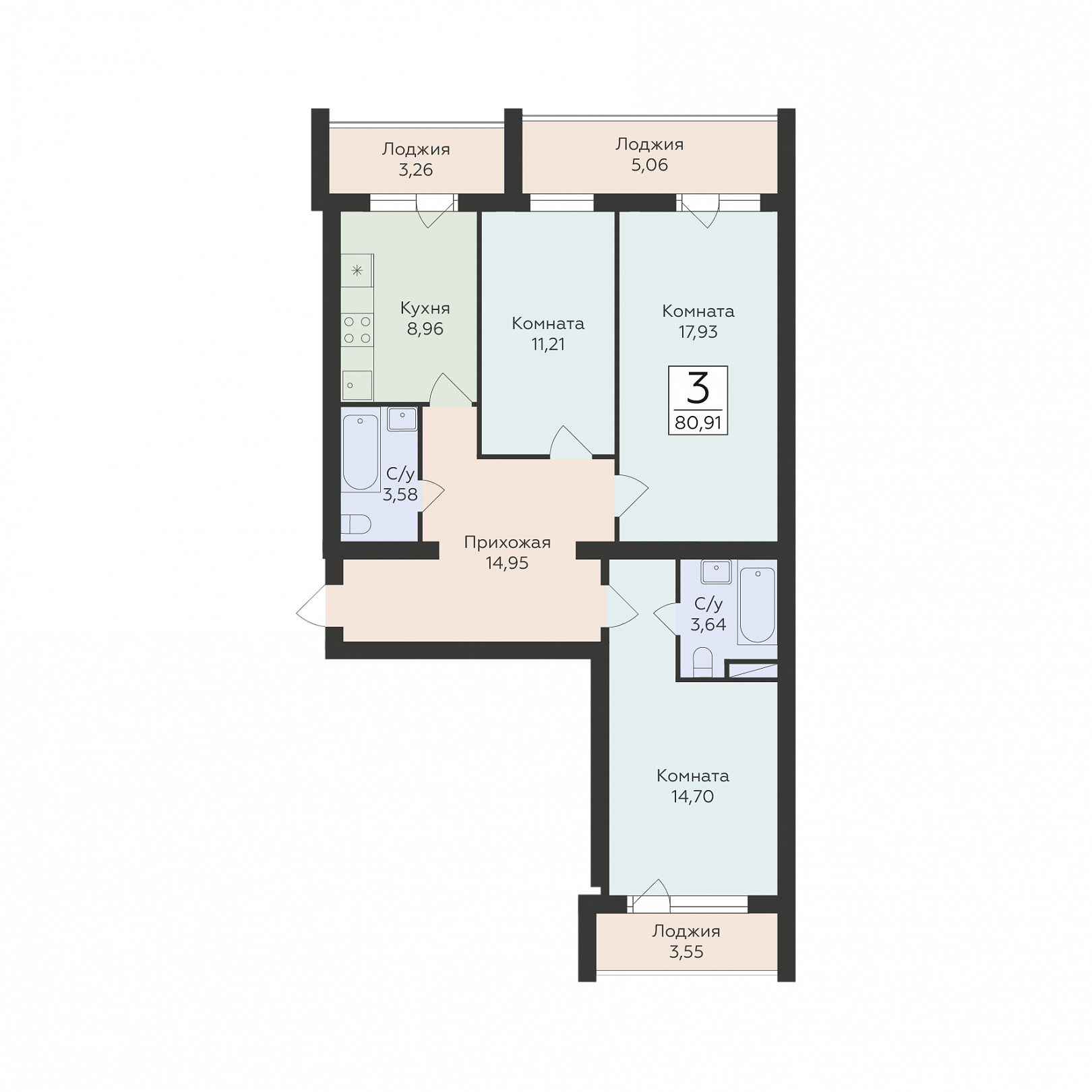 3-комнатная квартира, 80.91 м2, 11 этаж, №47, Юность