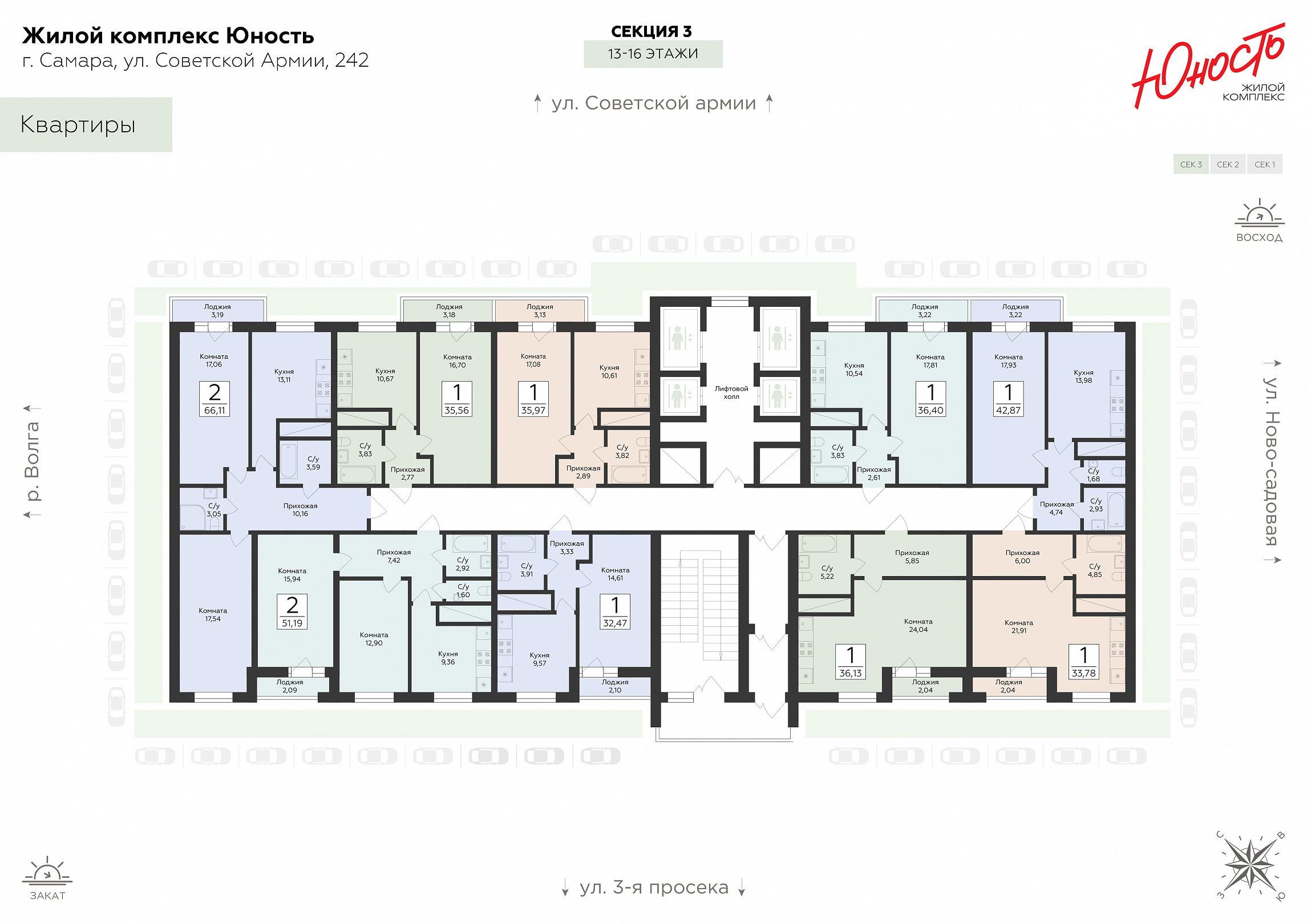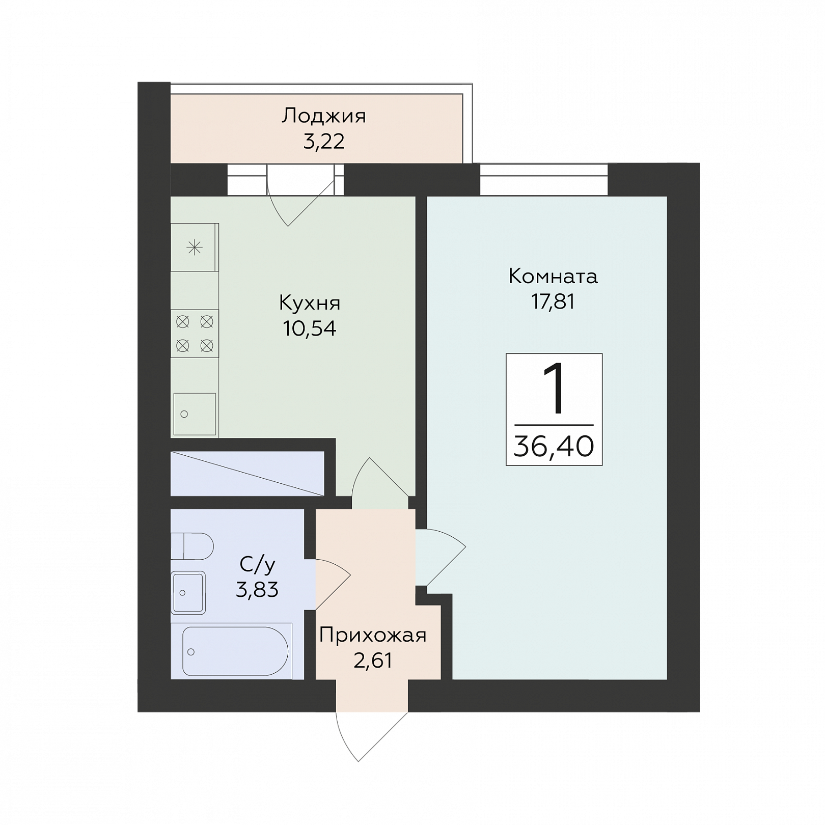 1-комнатная квартира, 36.4 м2, 15 этаж, №480, Юность