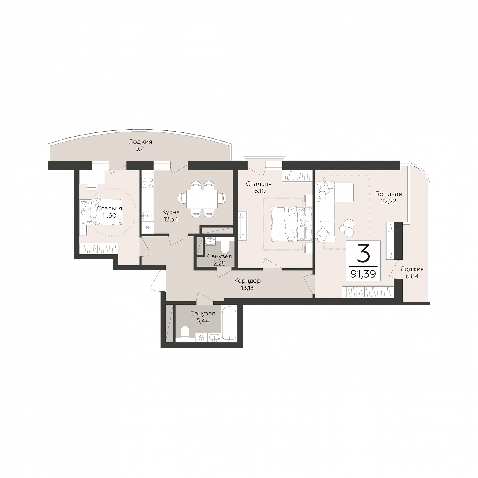 3-комнатная квартира, 91.39 м2, 11 этаж, №89, Скай