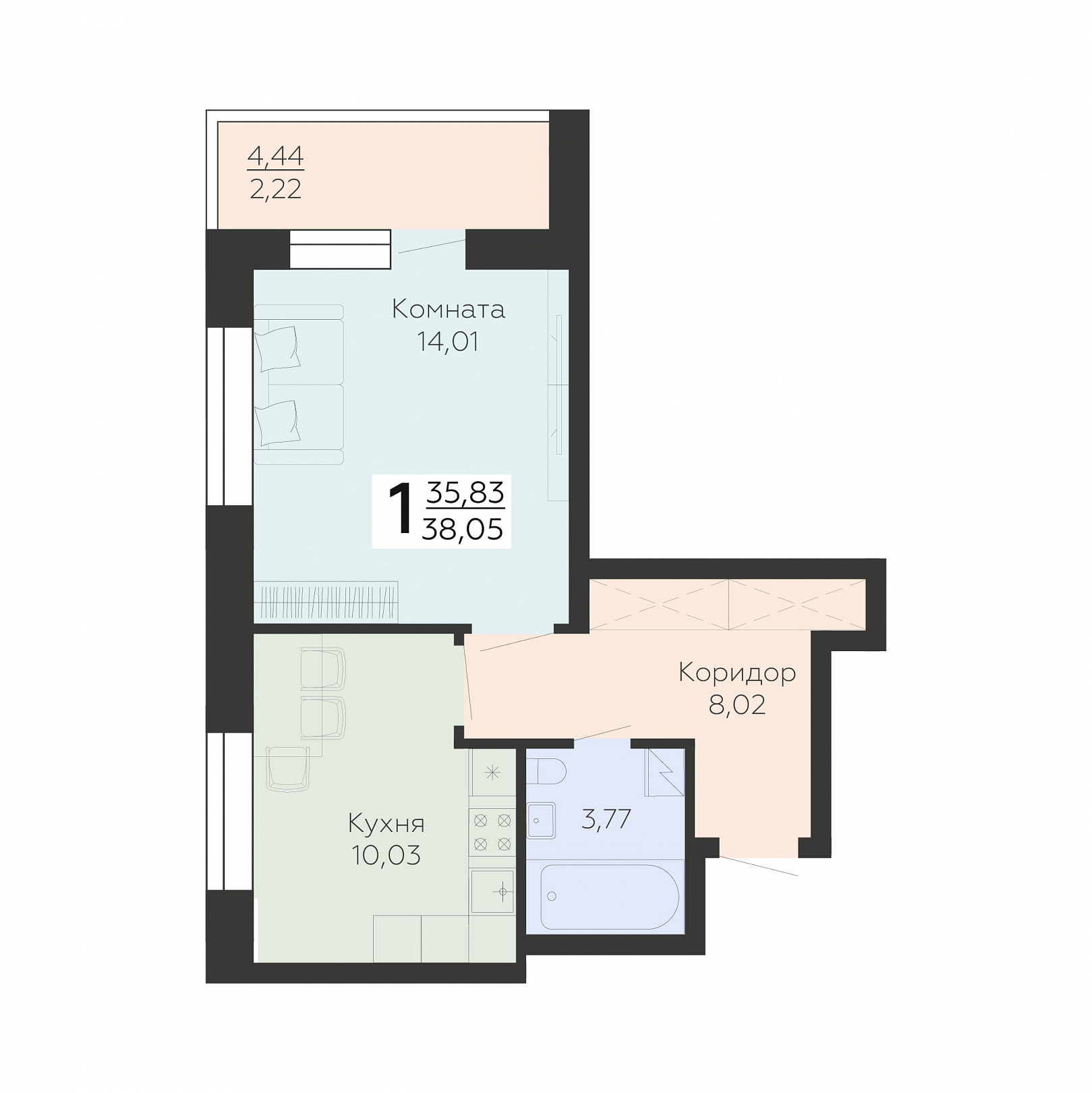 1-комнатная квартира, 38.05 м2, 4 этаж, №27, Зарядье