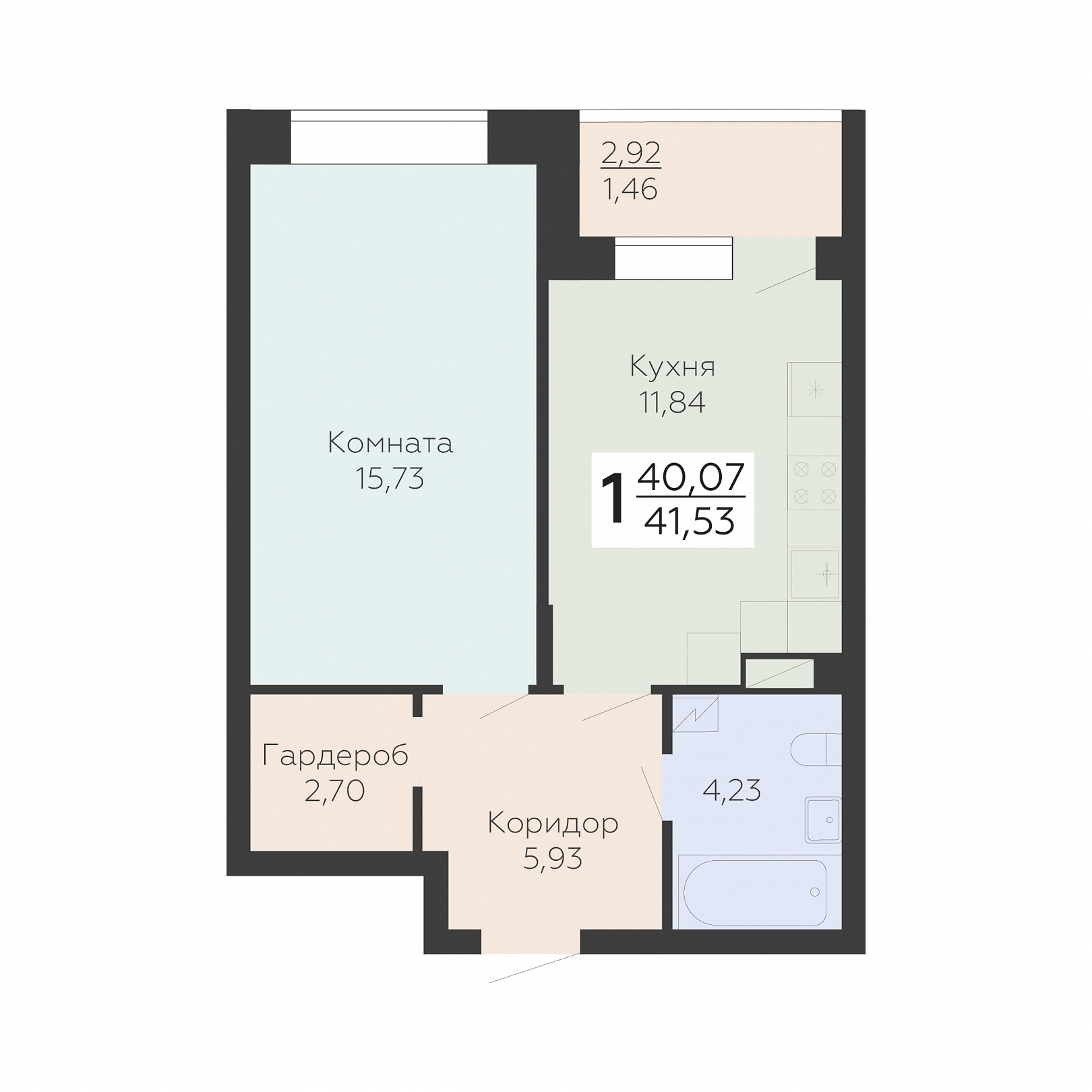 1-комнатная квартира, 41.53 м2, 4 этаж, №413, Зарядье