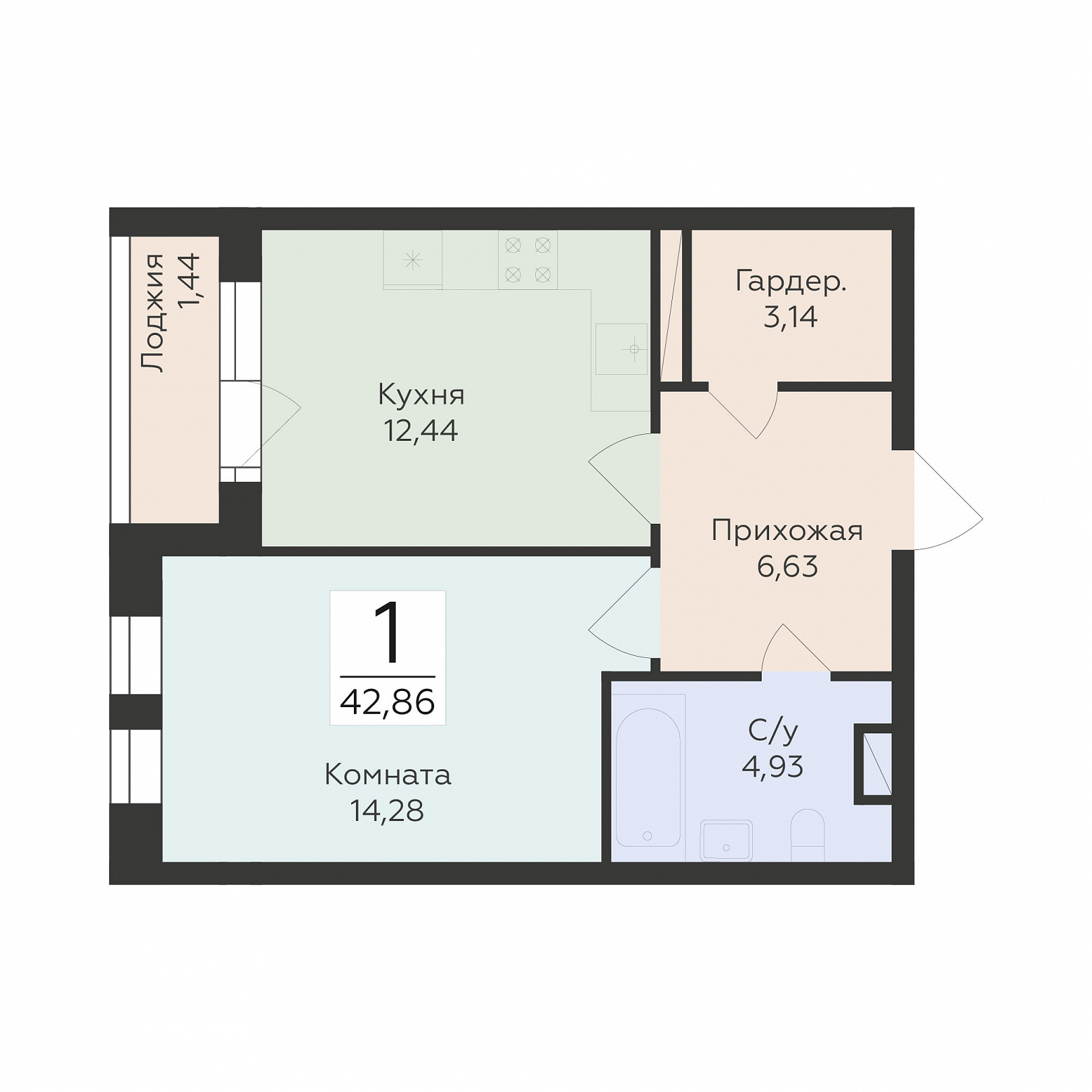 1-комнатная квартира, 42.86 м2, 9 этаж, №77, Октябрьский квартал