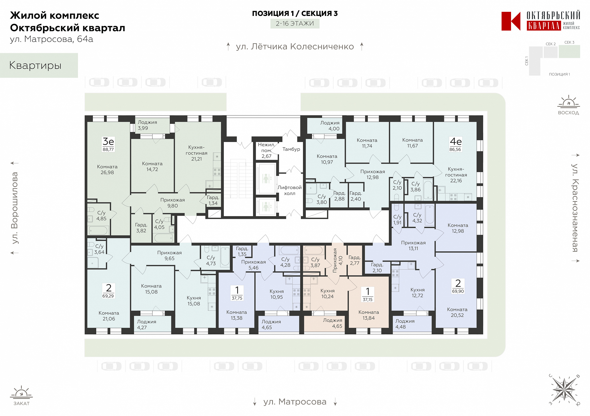 3-ком. квартира (Евро), 88.77 м2, 13 этаж, №226, Октябрьский квартал