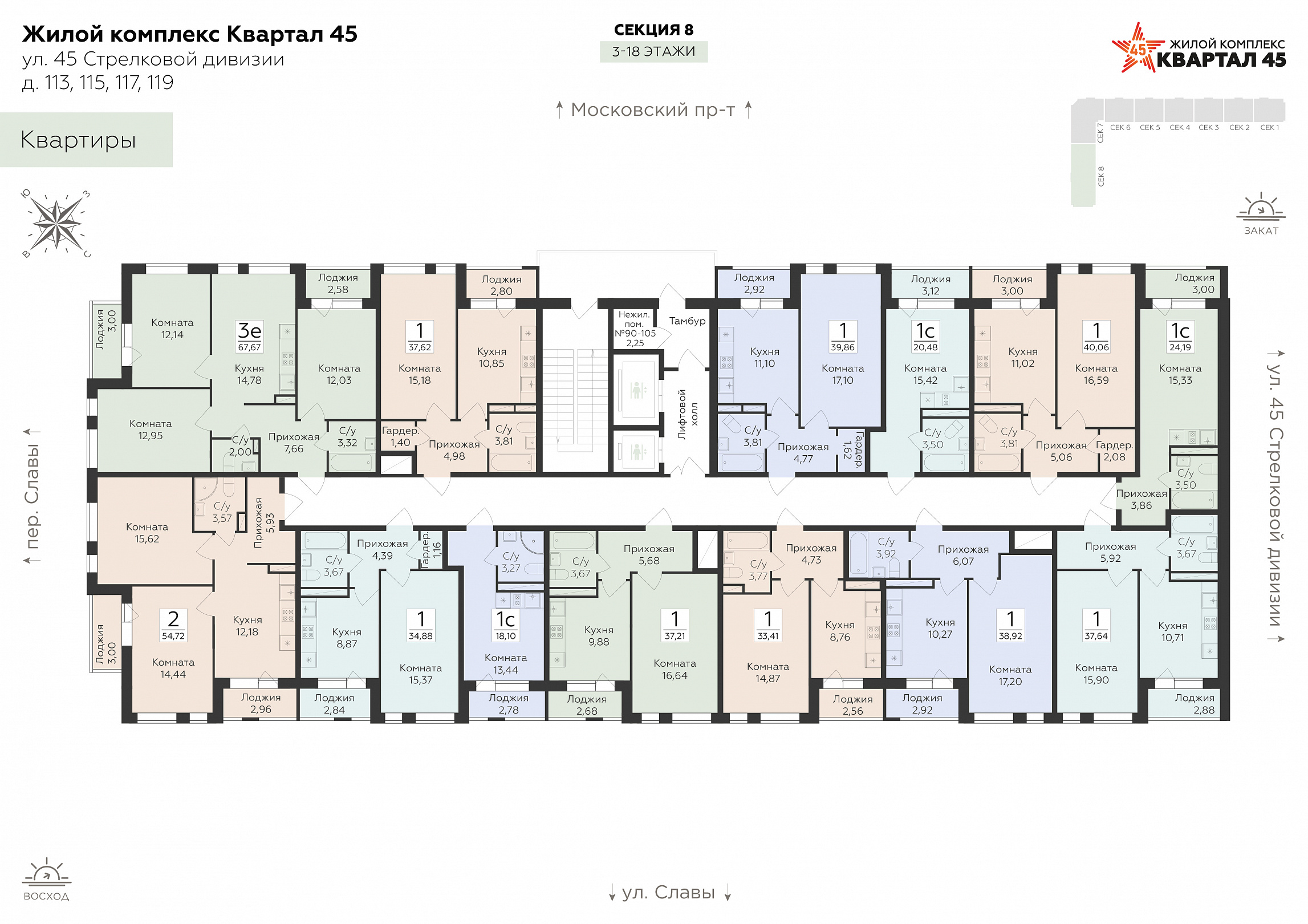 3-ком. квартира (Евро), 67.67 м2, 16 этаж, №181, Квартал 45