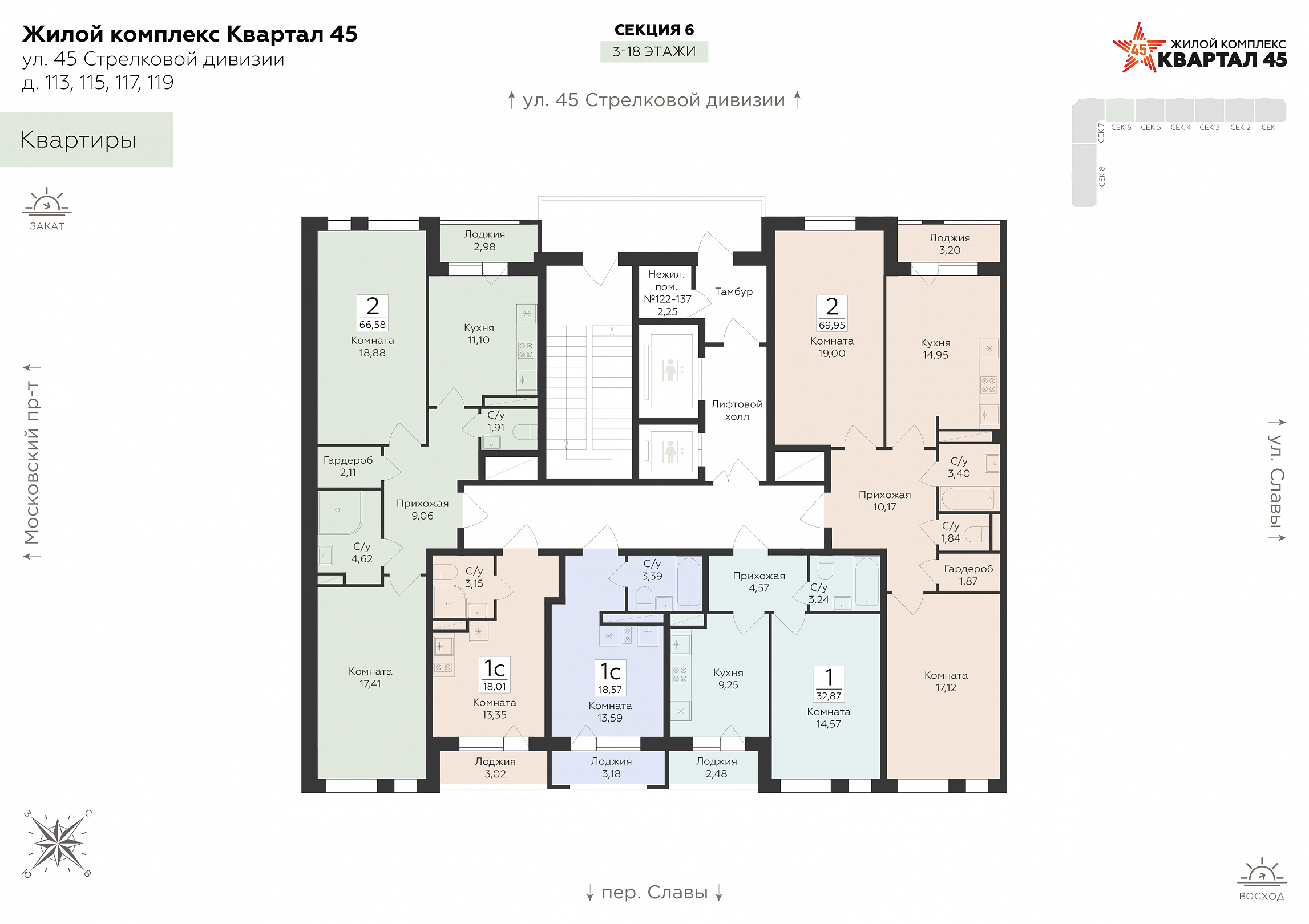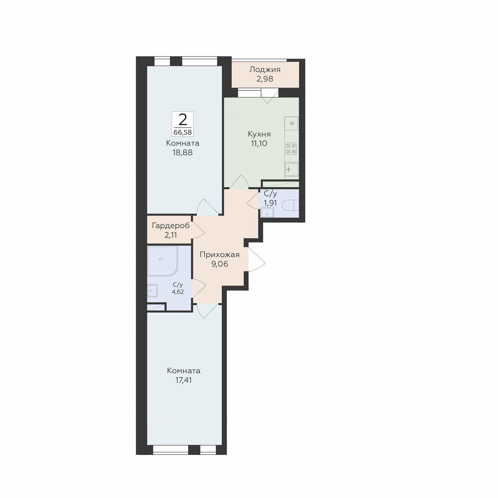 2-комнатная квартира, 66.58 м2, 16 этаж, №422, Квартал 45