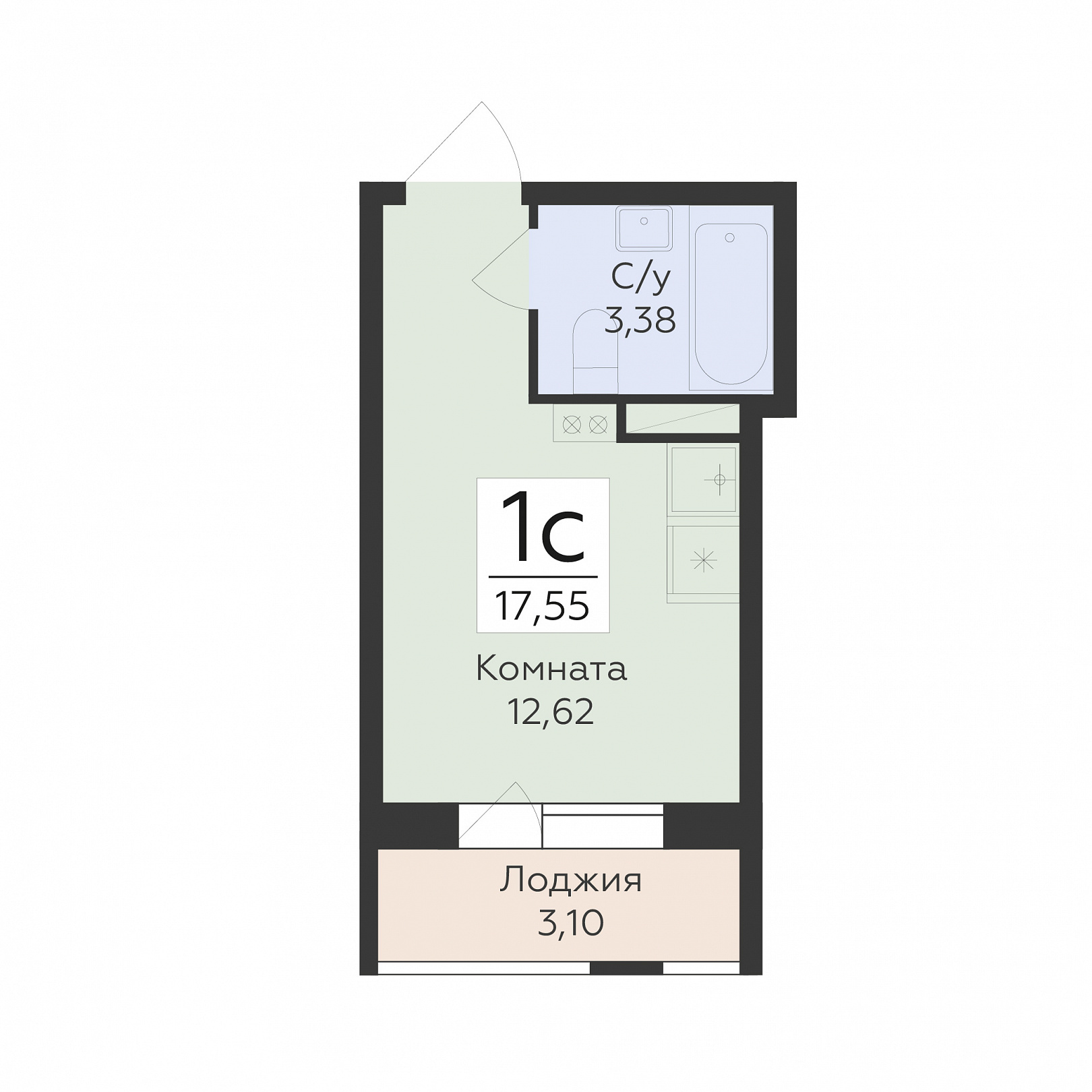 1-комнатная (студия), 17.55 м2, 18 этаж, №574, Квартал 45
