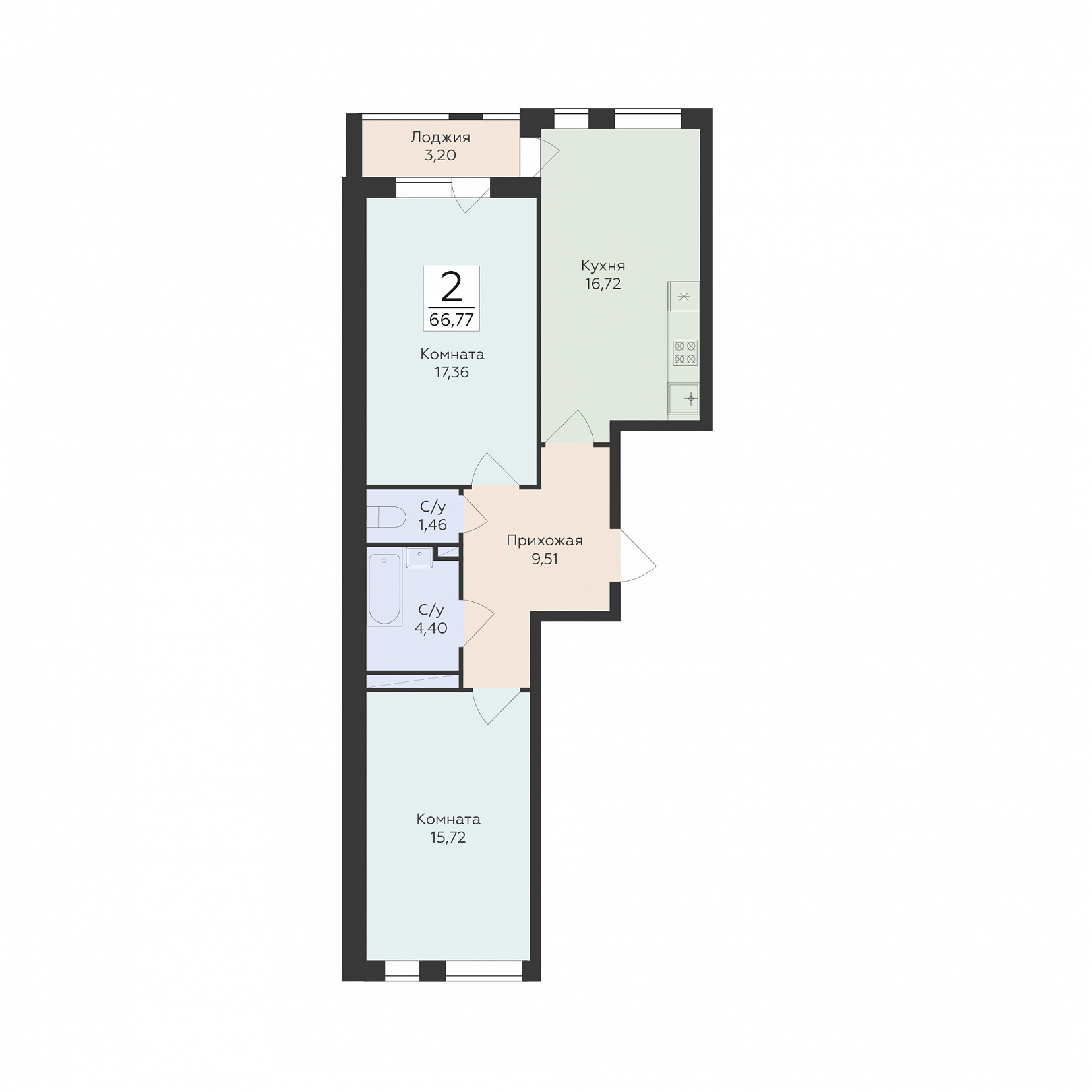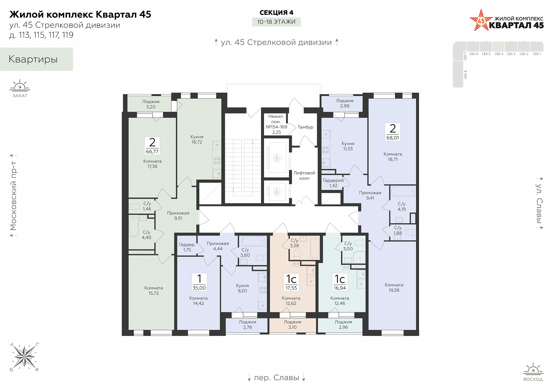 2-комнатная квартира, 66.77 м2, 8 этаж, №526, Квартал 45
