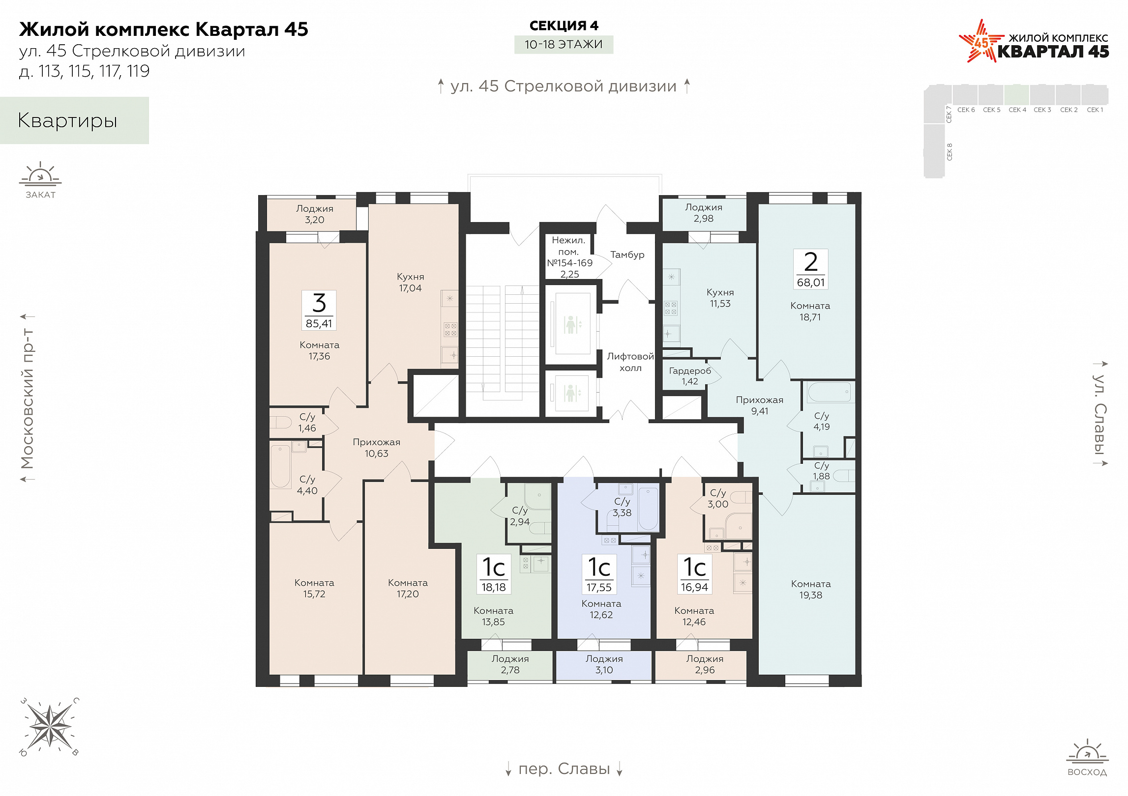 3-комнатная квартира, 85.41 м2, 15 этаж, №561, Квартал 45