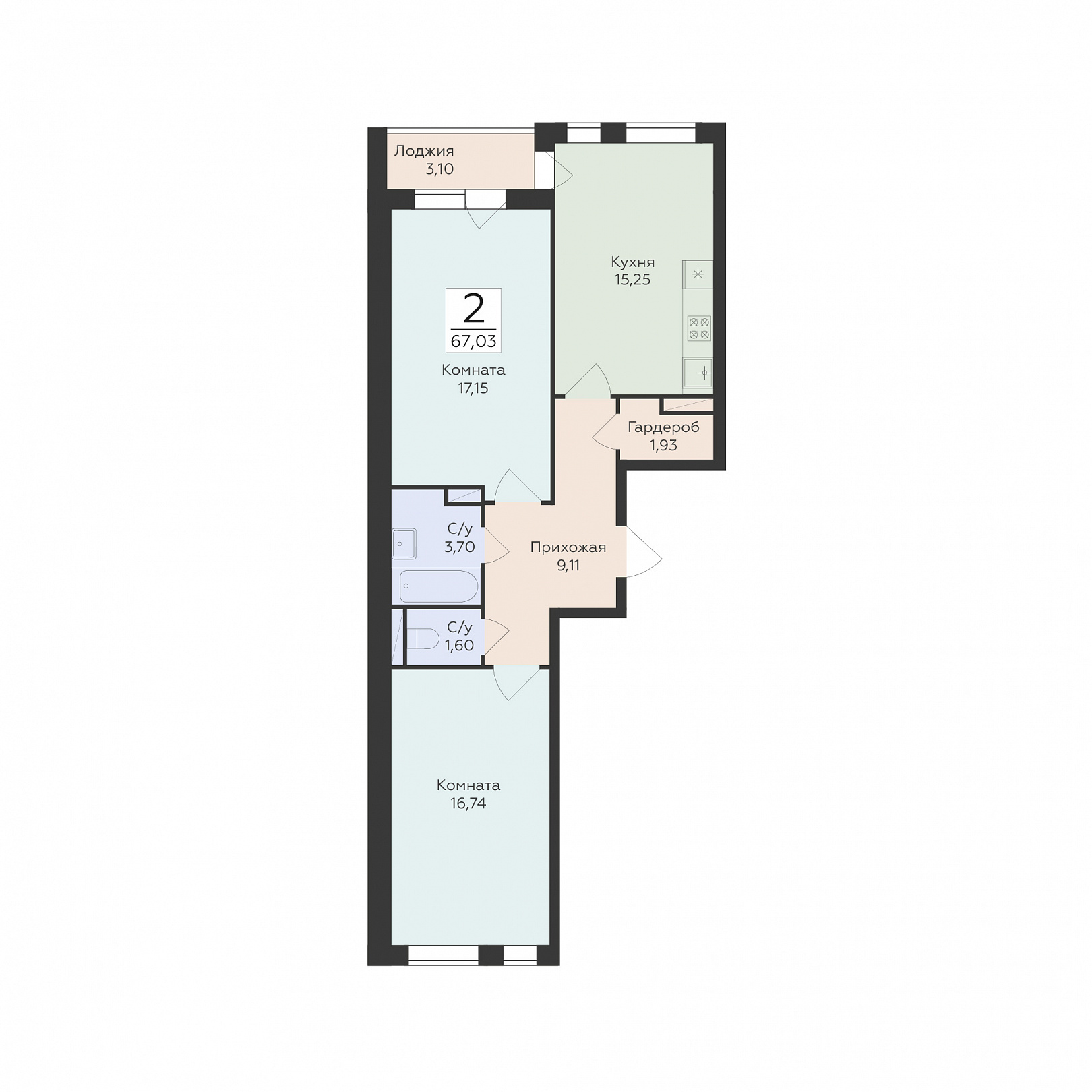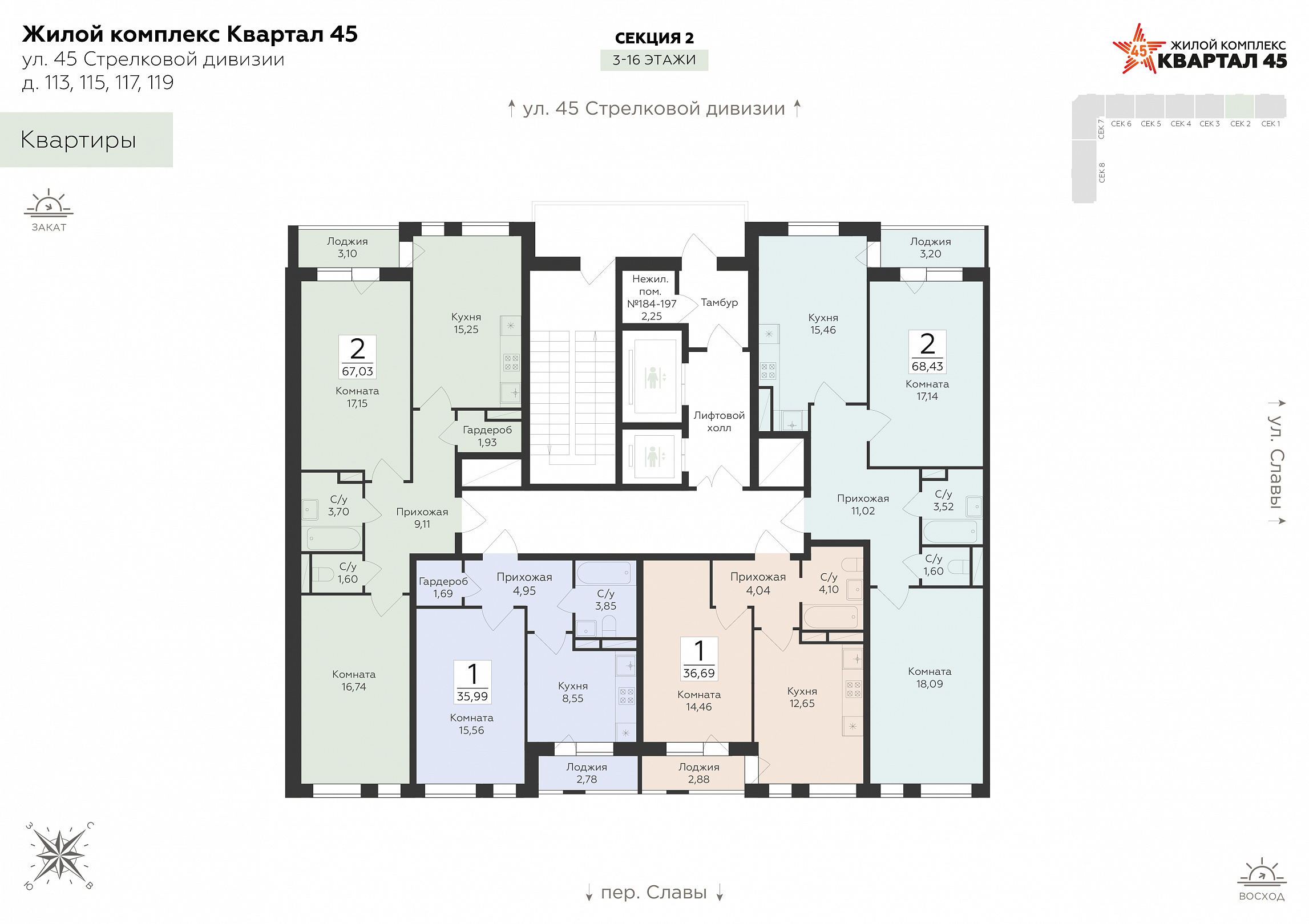 2-комнатная квартира, 67.03 м2, 5 этаж, №658, Квартал 45