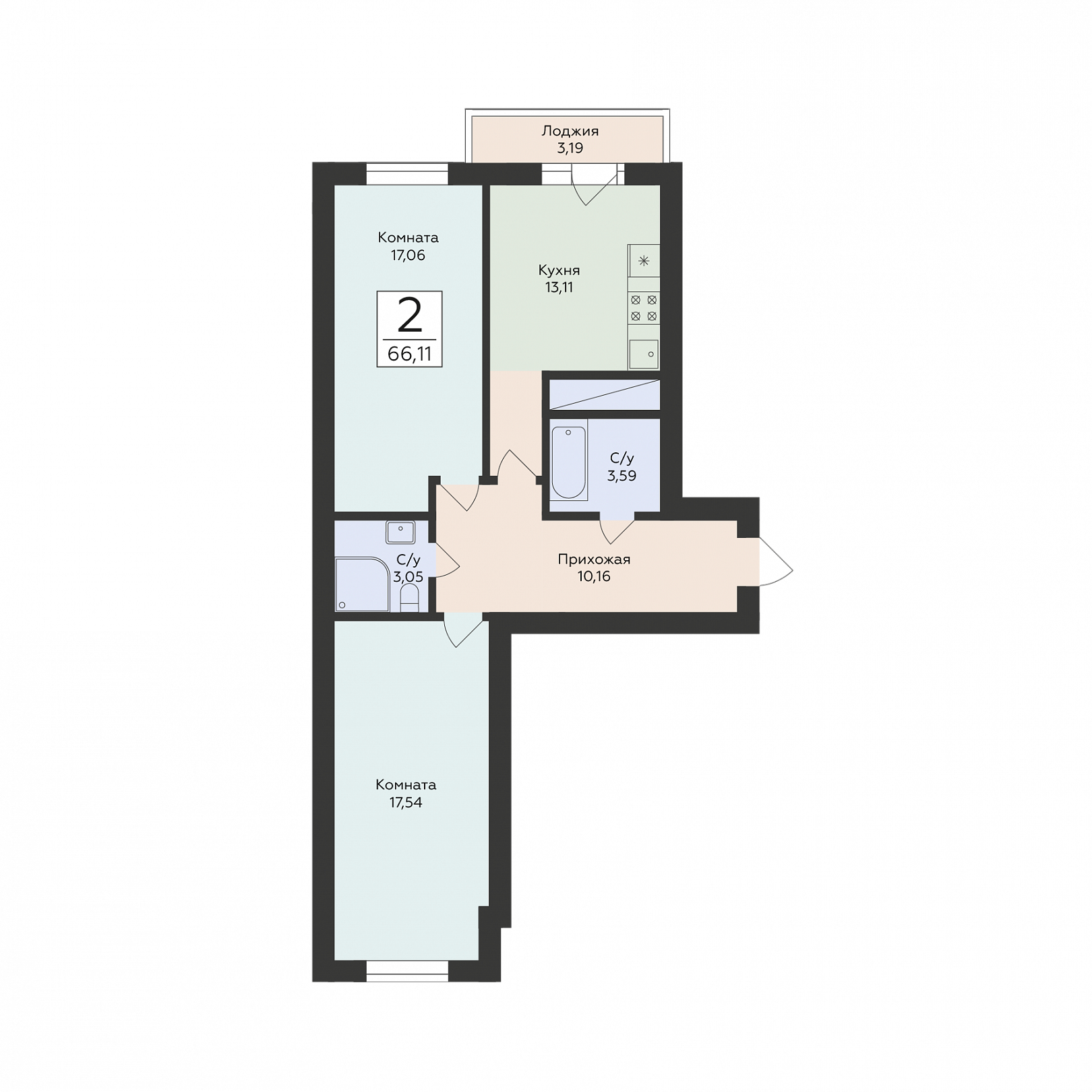 2-комнатная квартира, 66.11 м2, 17 этаж, №495, Юность