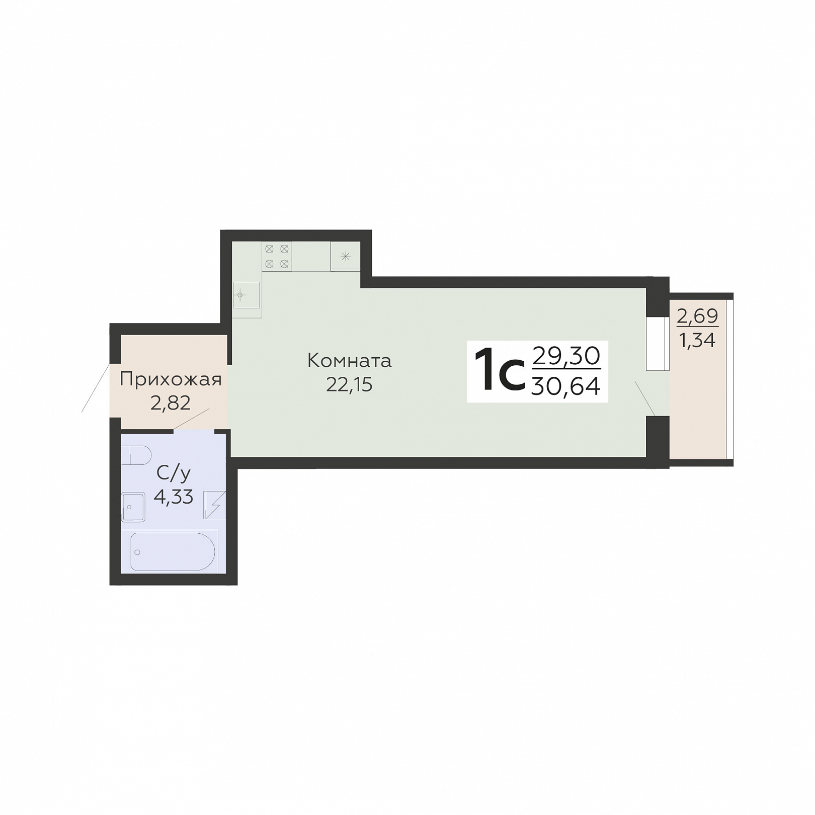 1-комнатная (студия), 30.64 м2, 17 этаж, №1 062, Никитинские сады