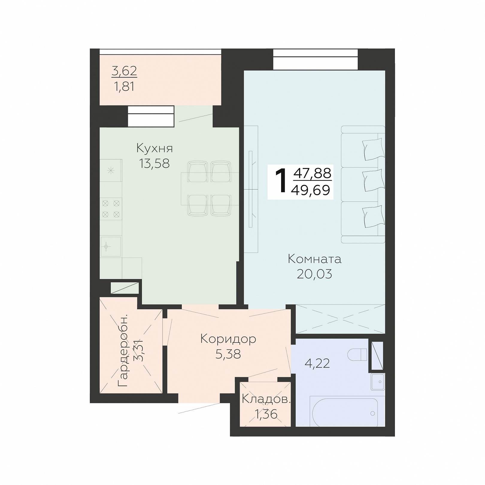 1-комнатная квартира, 49.69 м2, 6 этаж, №54, Зарядье