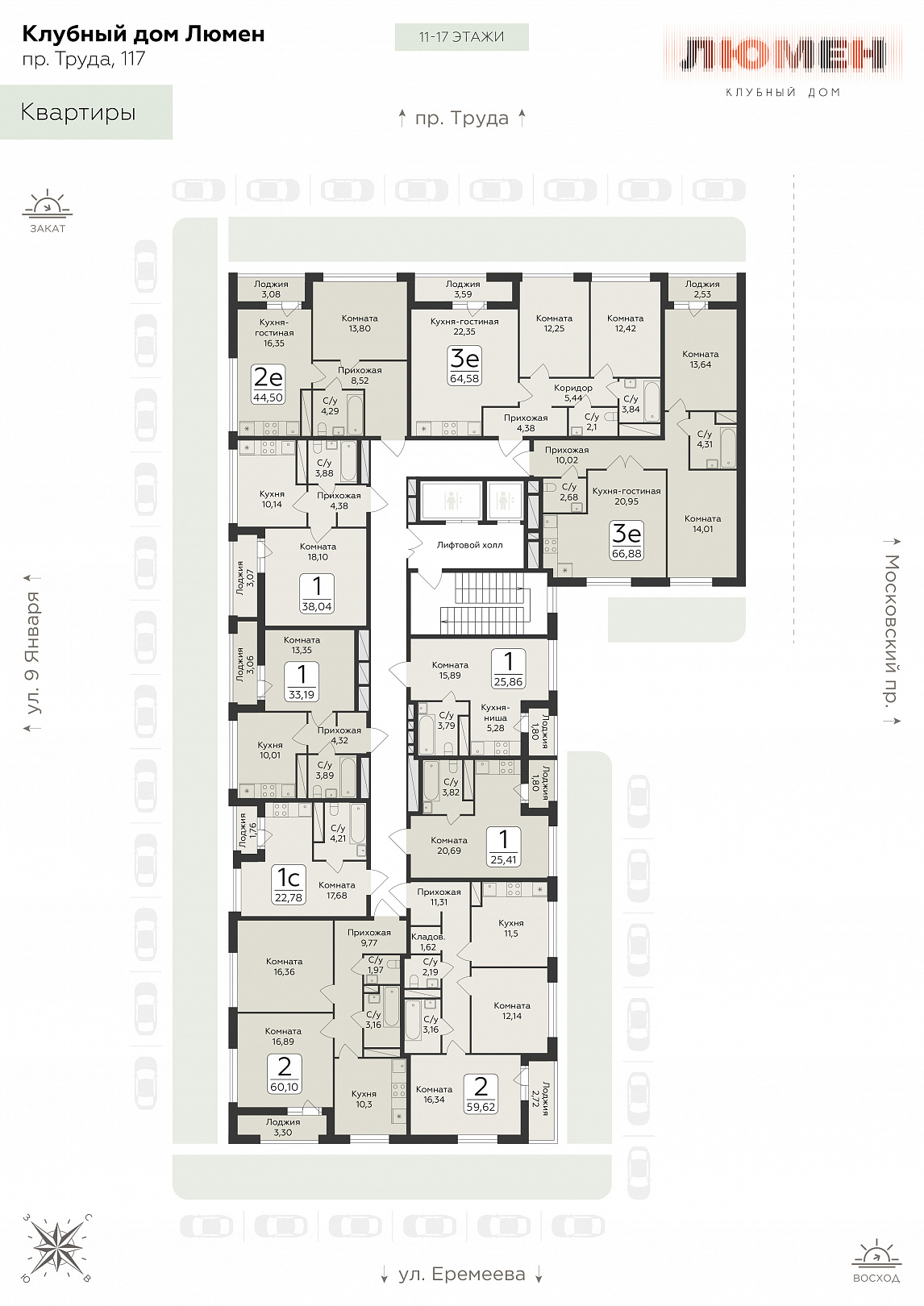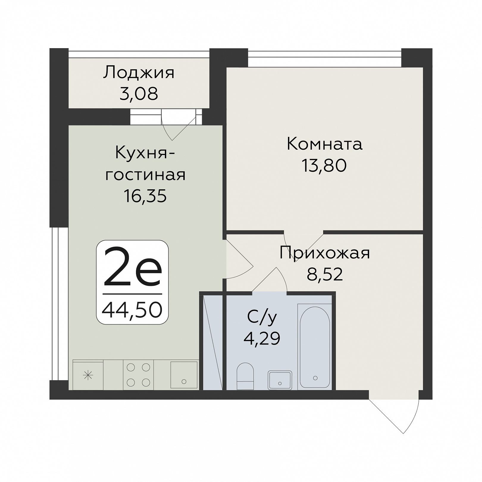 2-ком. квартира (Евро), 44.61 м2, 14 этаж, №128, Люмен