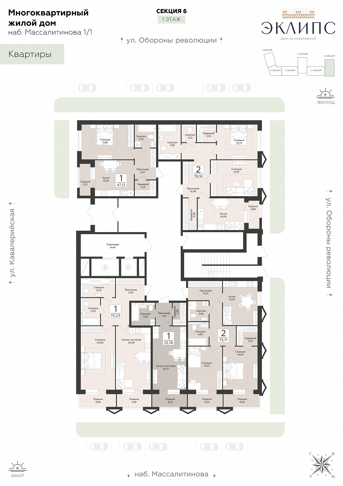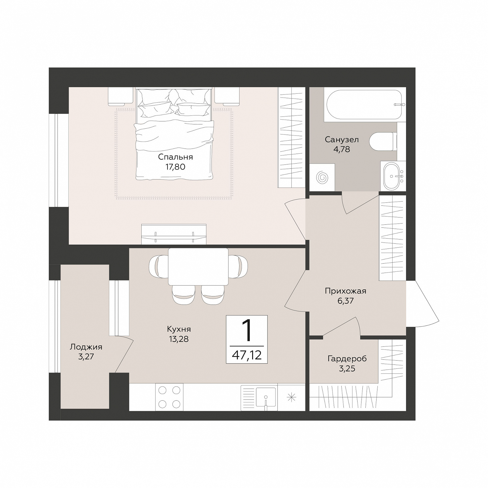 1-комнатная квартира, 47.12 м2, 1 этаж, №4, Эклипс