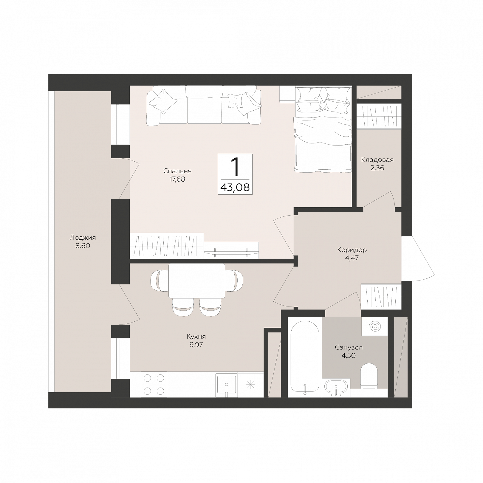 1-комнатная квартира, 43.08 м2, 11 этаж, №86, Скай