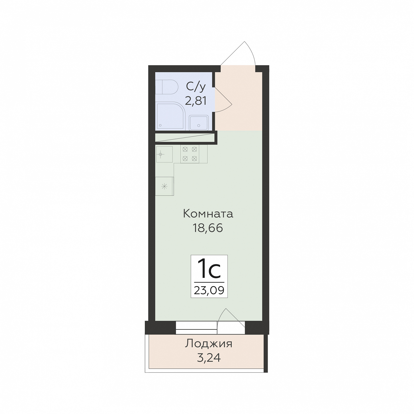 1-комнатная (студия), 23.09 м2, 4 этаж, №32, Авиапарк