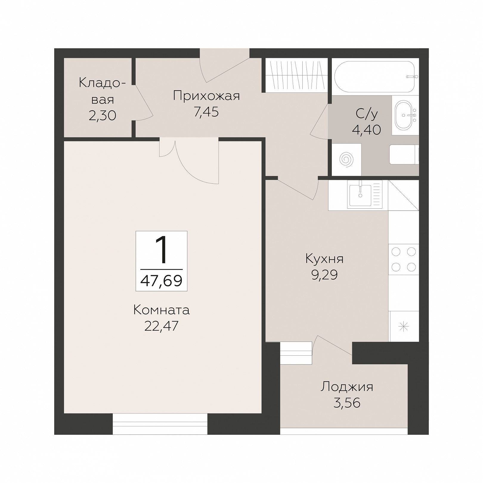 1-комнатная квартира, 47.69 м2, 5 этаж, №111, Пахра Сити