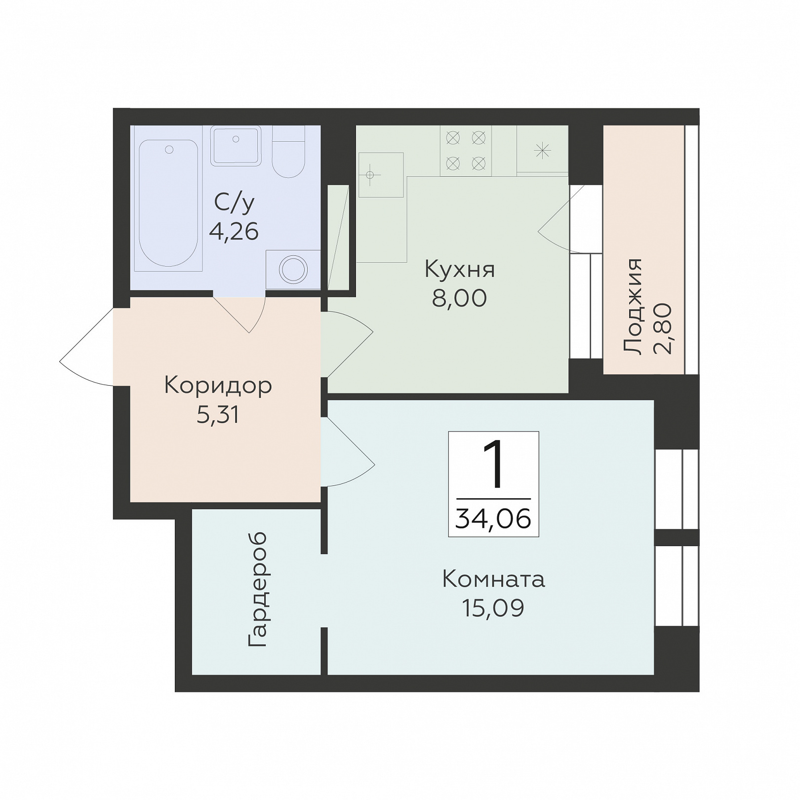 1-комнатная квартира, 34.06 м2, 6 этаж, №28, Октябрьский квартал
