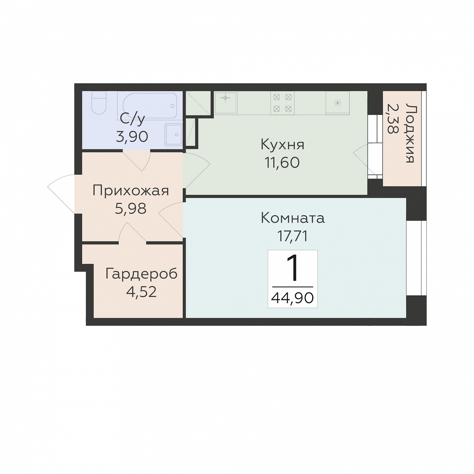 1-комнатная квартира, 44.9 м2, 7 этаж, №239, Октябрьский квартал