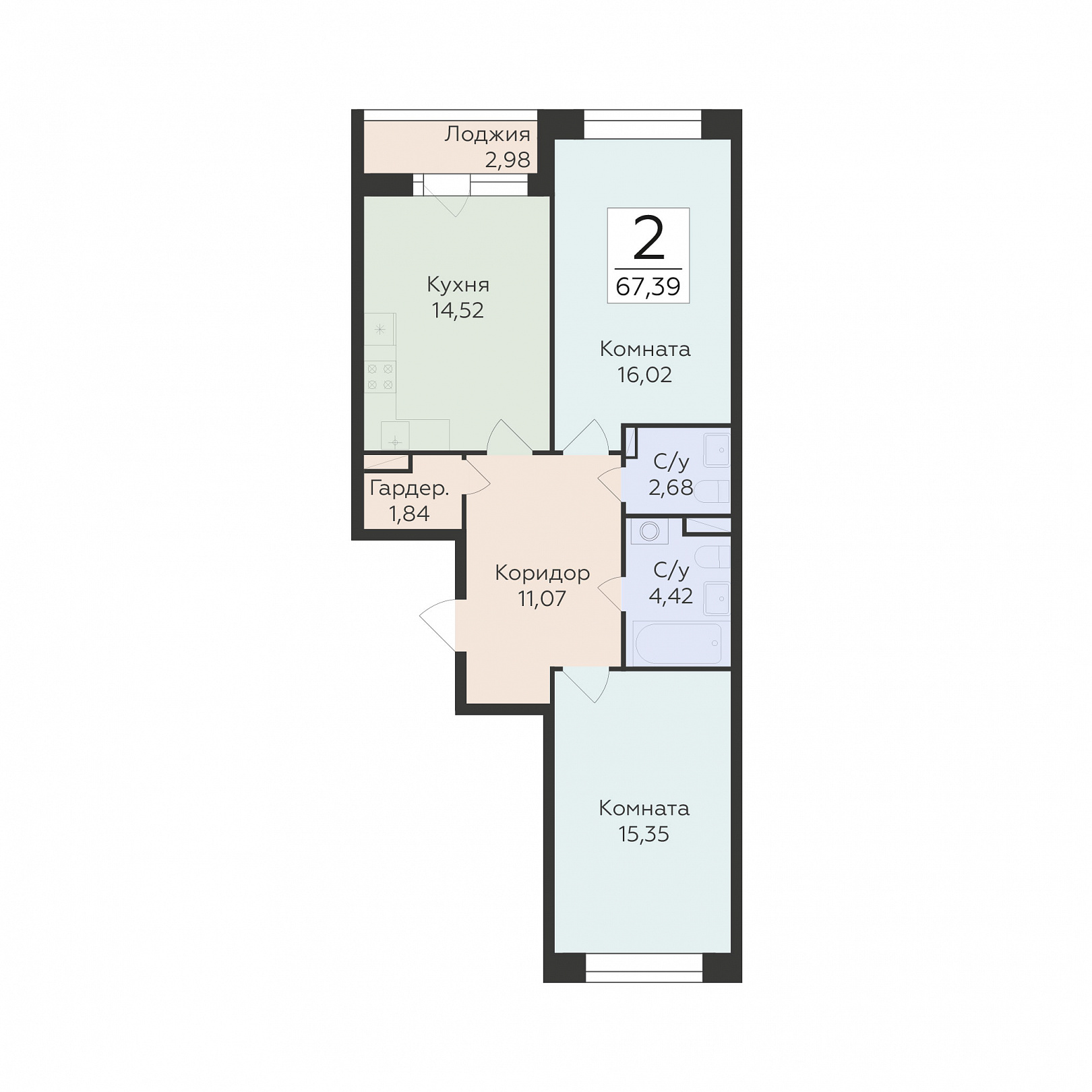 2-комнатная квартира, 67.39 м2, 7 этаж, №131, Октябрьский квартал