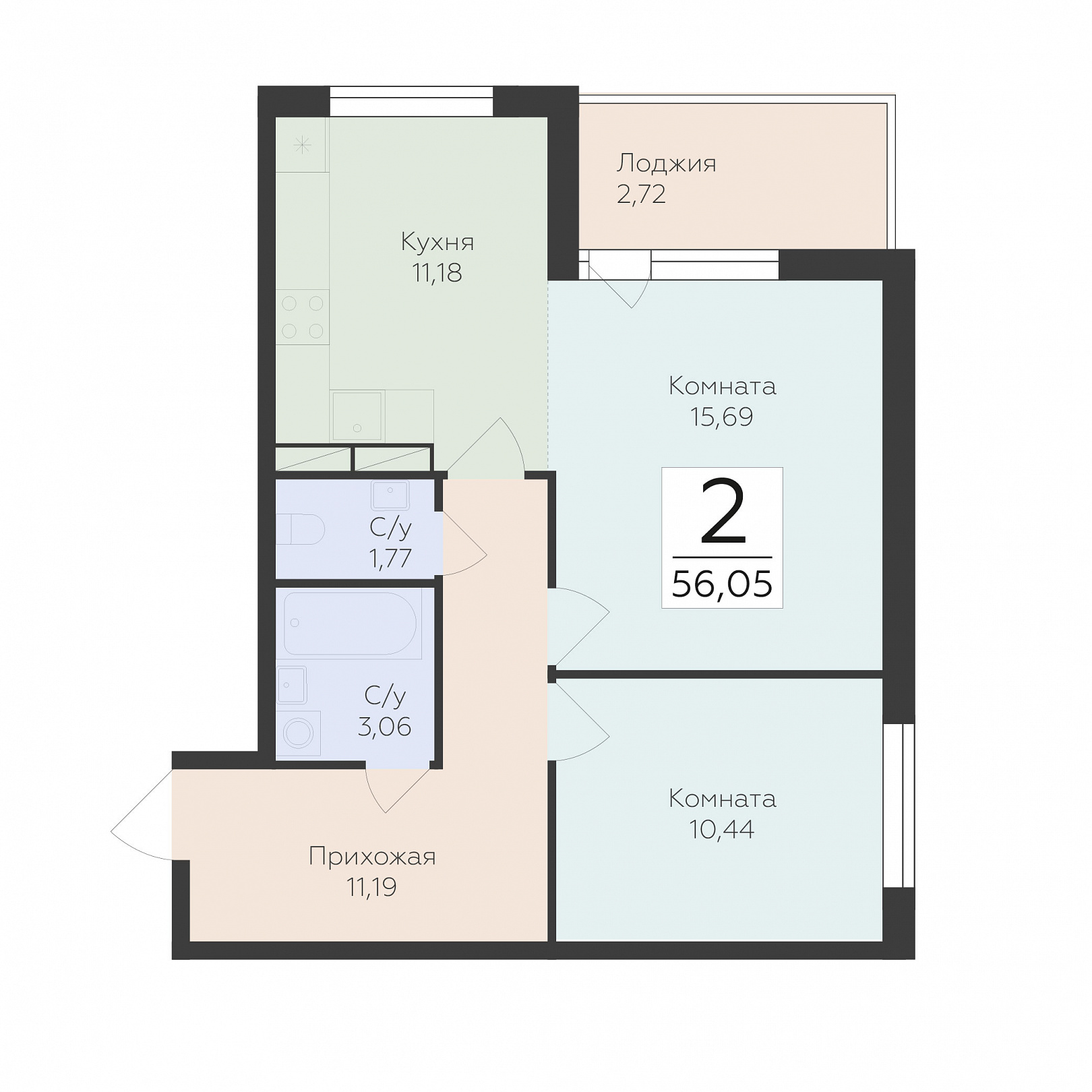 2-комнатная квартира, 56.05 м2, 6 этаж, №74, ФИНСКИЙ КВАРТАЛ