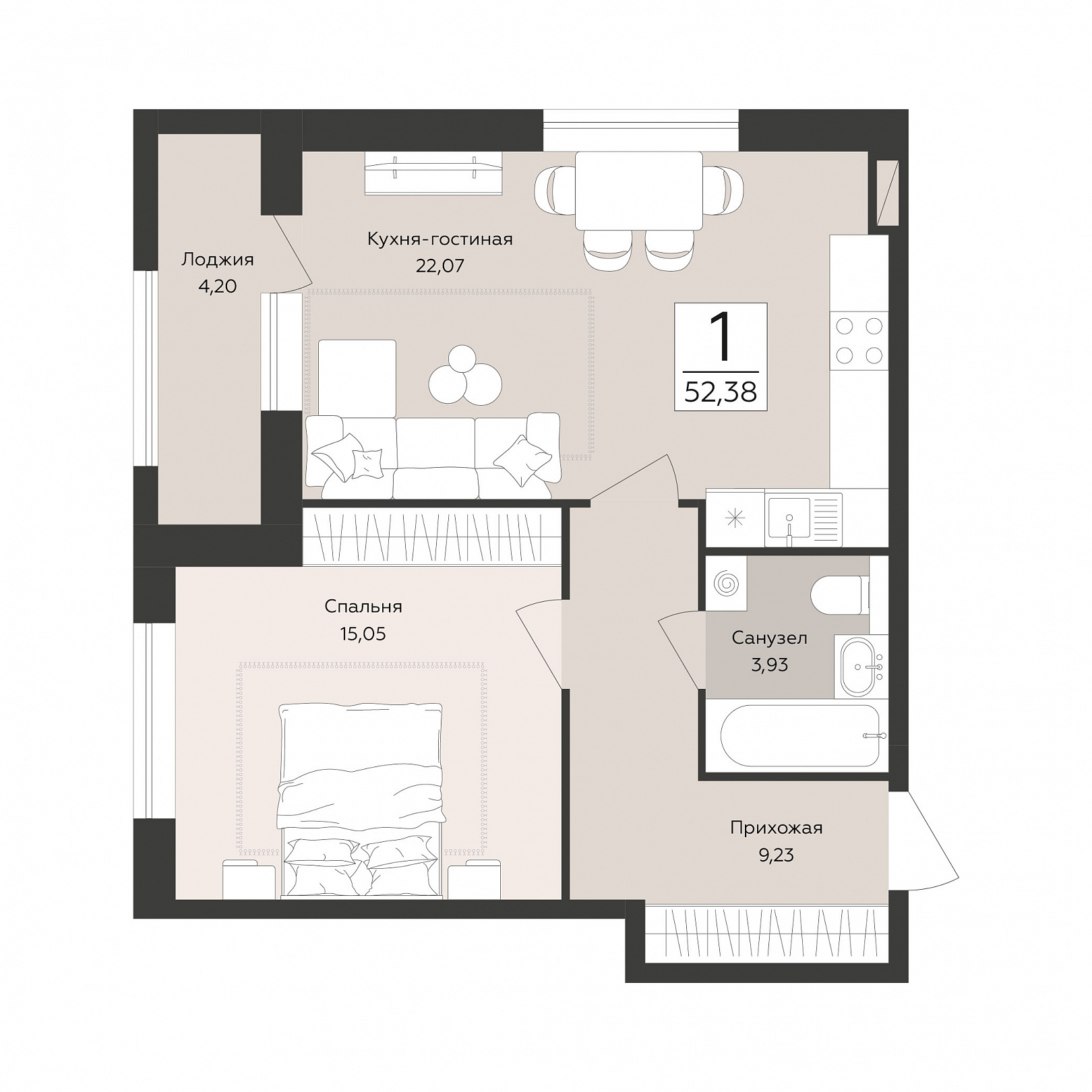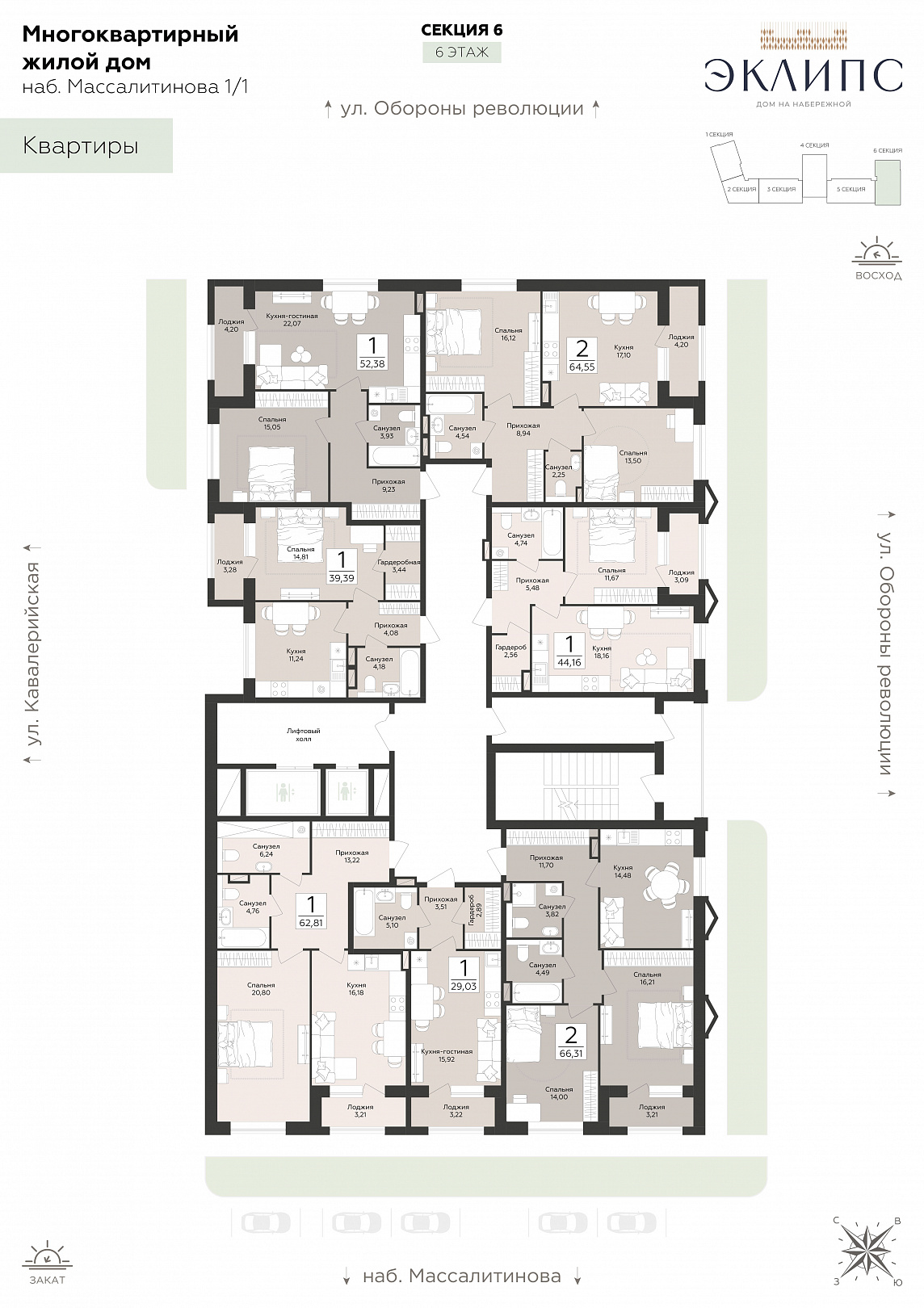 1-комнатная квартира, 52.38 м2, 6 этаж, №36, Эклипс