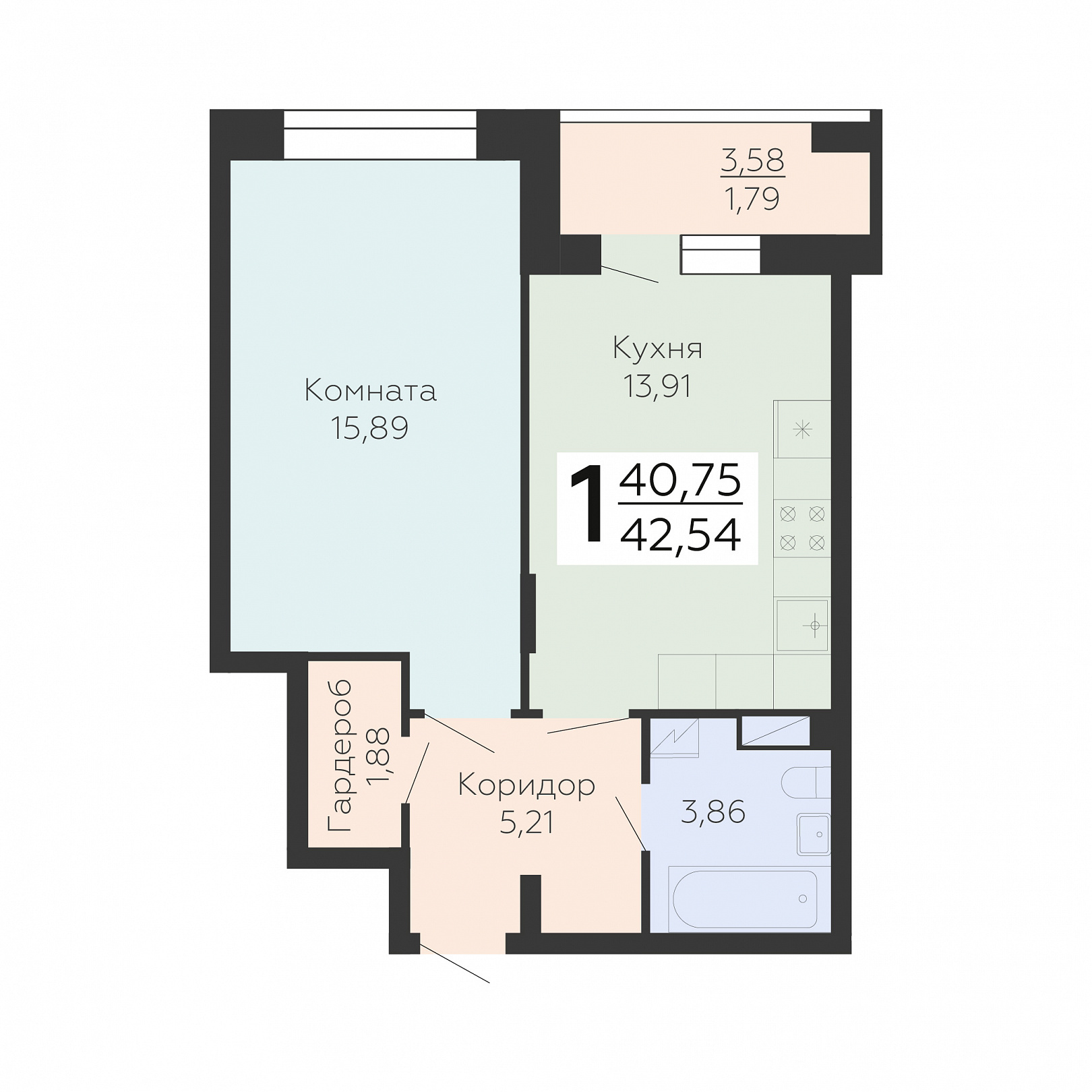 1-комнатная квартира, 42.54 м2, 6 этаж, №268, Зарядье