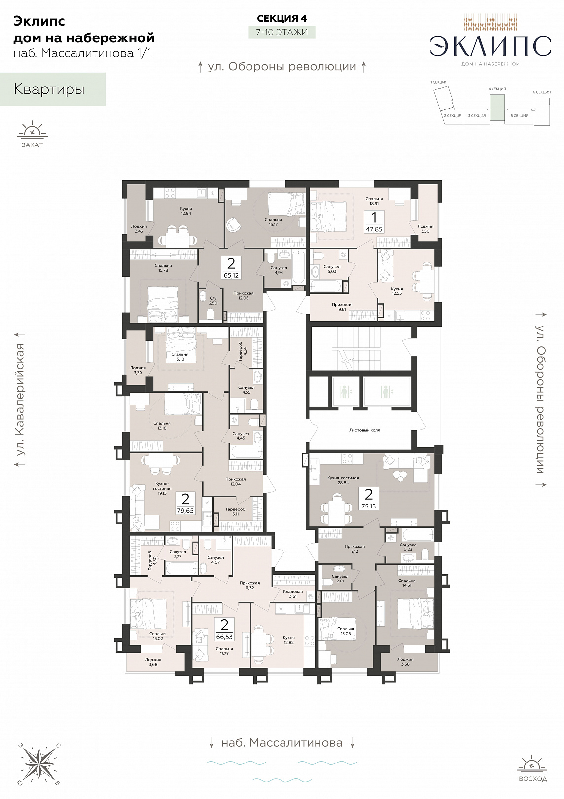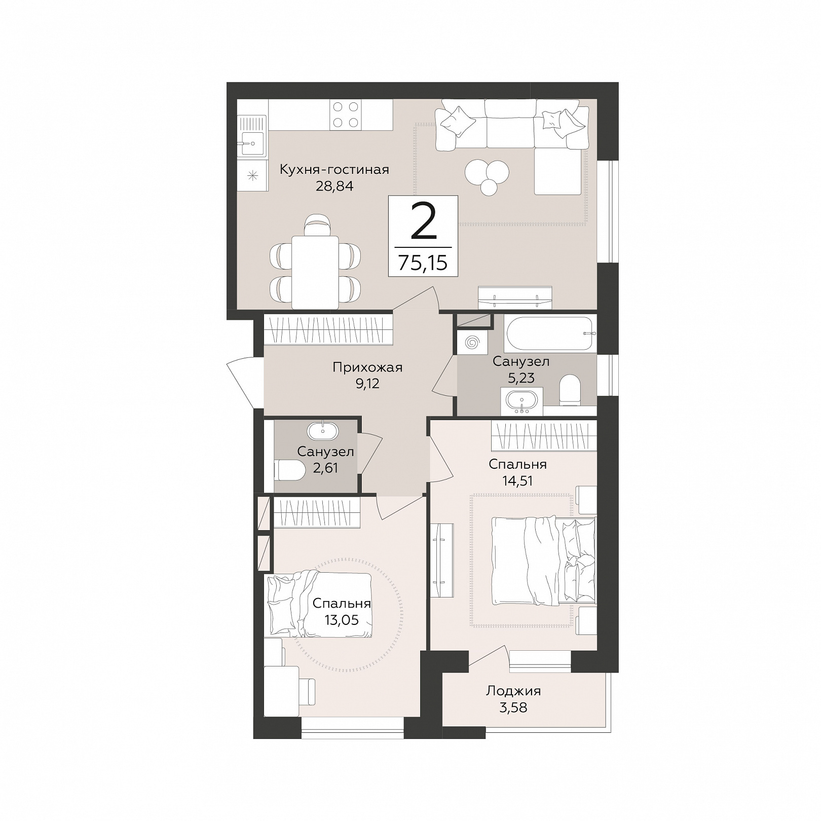 2-комнатная квартира, 75.15 м2, 8 этаж, №144, Эклипс