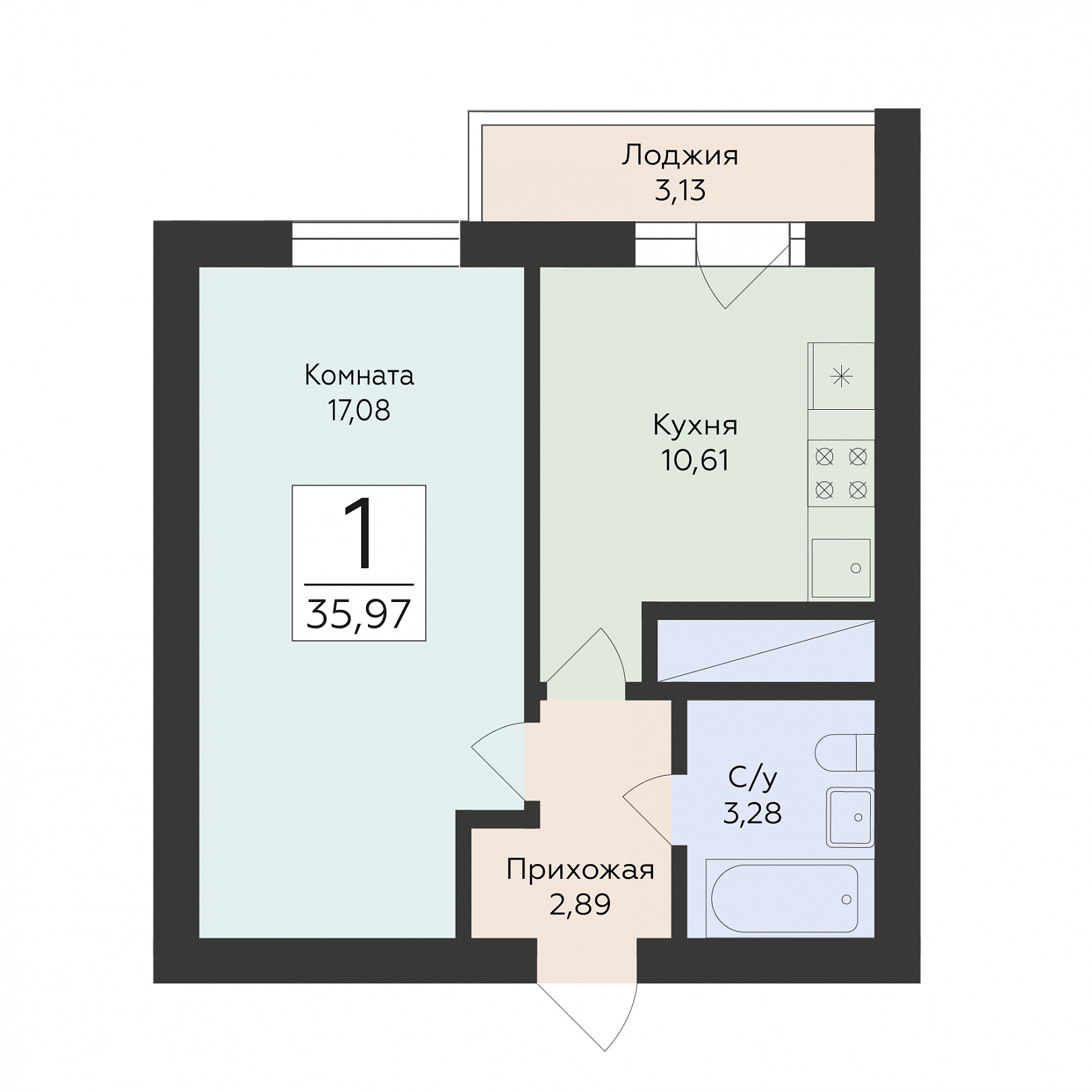 1-комнатная квартира, 35.97 м2, 11 этаж, №443, Юность