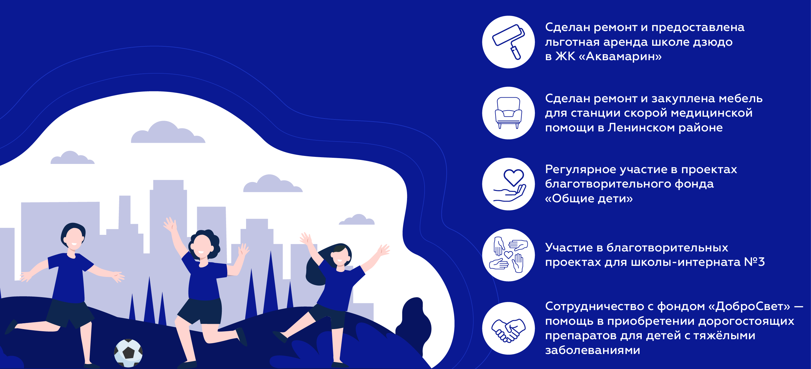 В районах перспективной застройки ГК «Развитие» участвует в проектировании реконструкции и ремонте школ, занимается строительством детских садов, организацией общественных пространств.