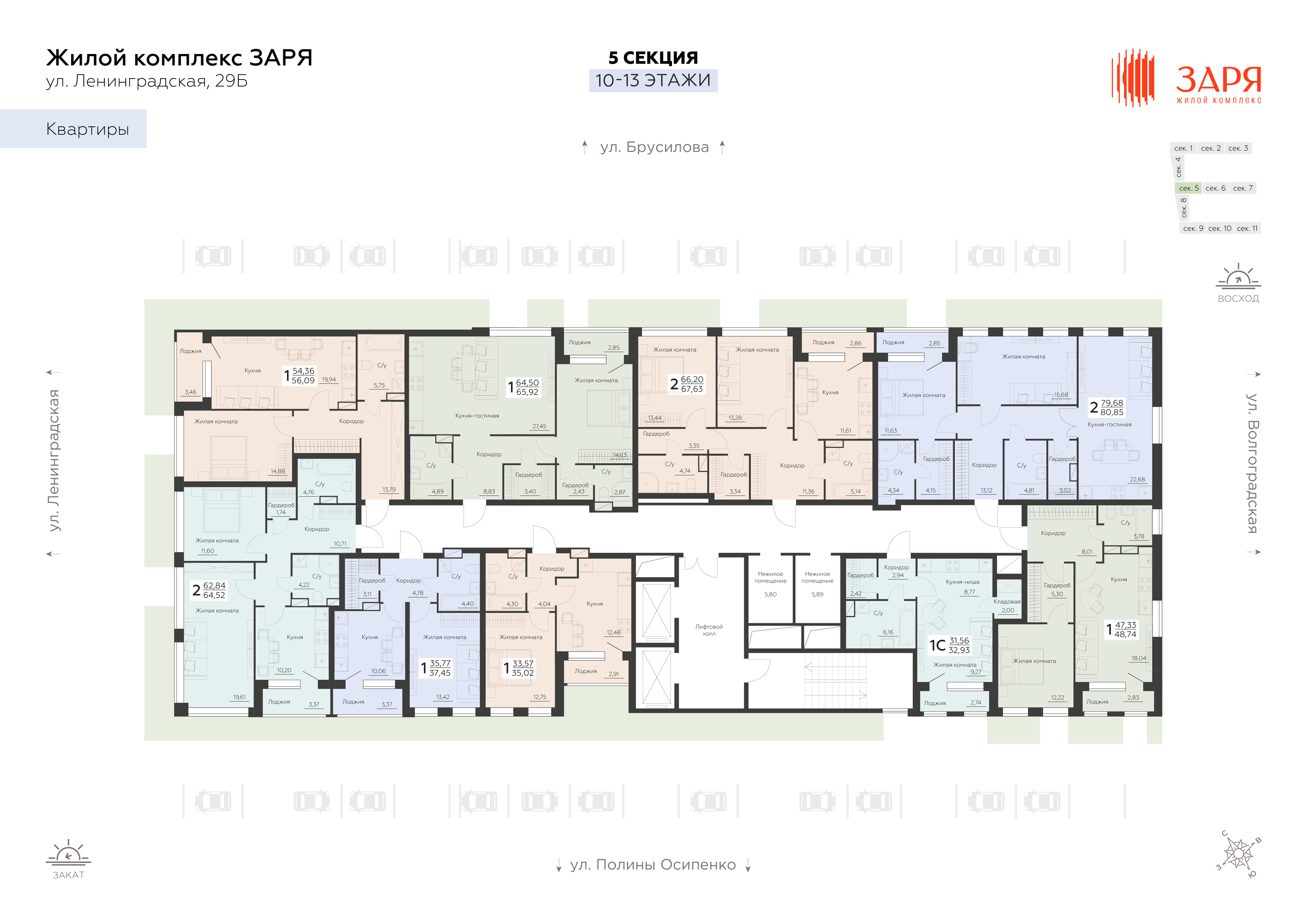 Жилой комплекс «Заря» находится рядом с СК «Чернавская дамба», ТЦ «Европа», Парком Патриотов и парком «Алые паруса». В нескольких минутах ходьбы расположена остановка общественного транспорта "Улица Брусилова", автомобильный выезд на Ленинский проспект и Чернавский мост, откуда вы можете добраться до исторического центра не более чем за 15 минут. В шаговой доступности школы, детские сады, магазины, салоны красоты, медицинские и спортивные центры.